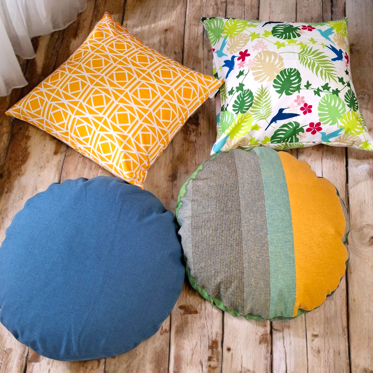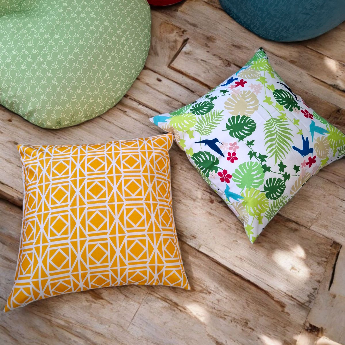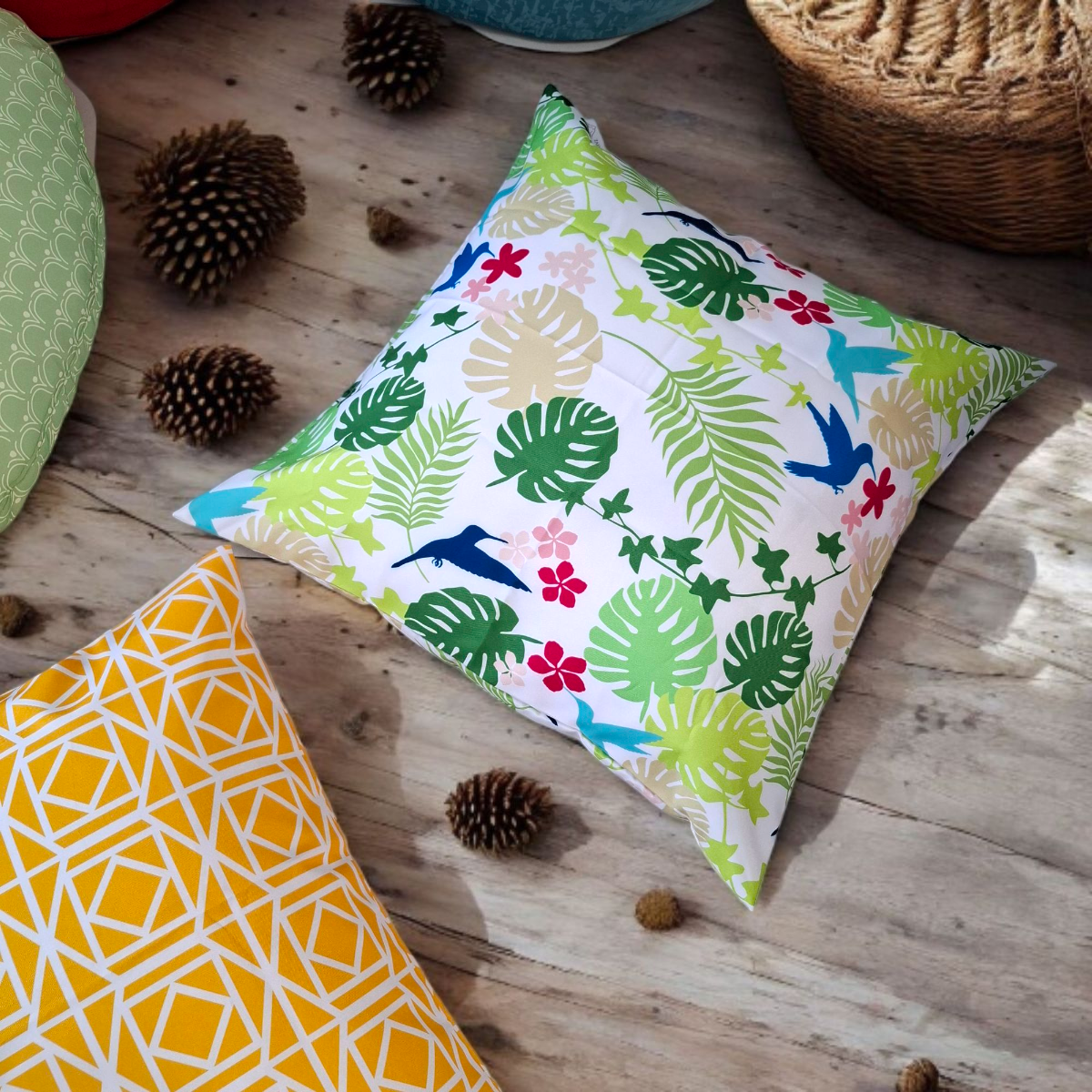 Secret Garden outdoor floor cushion in a tropical leaves and hummingbirds pattern is ideal for the indoors or outdoors. Waterproof outer cover and waterproof inner case.