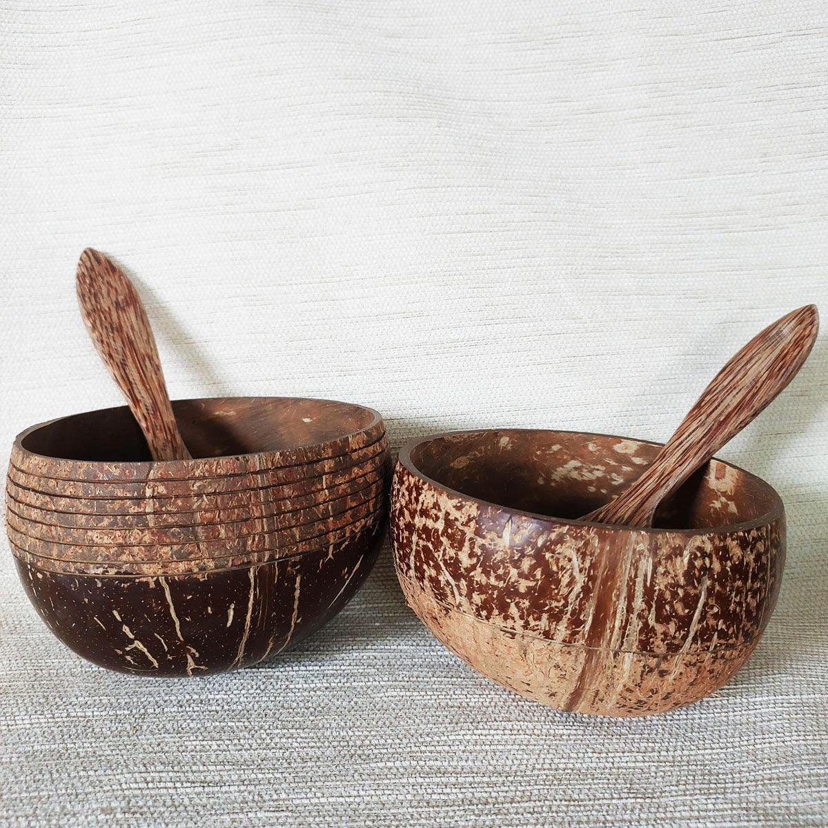 Size - each coconut shell bowl is approx. 4.5" wide 2.5" high. Each coconut wood spoon is approx. 7.5" long.