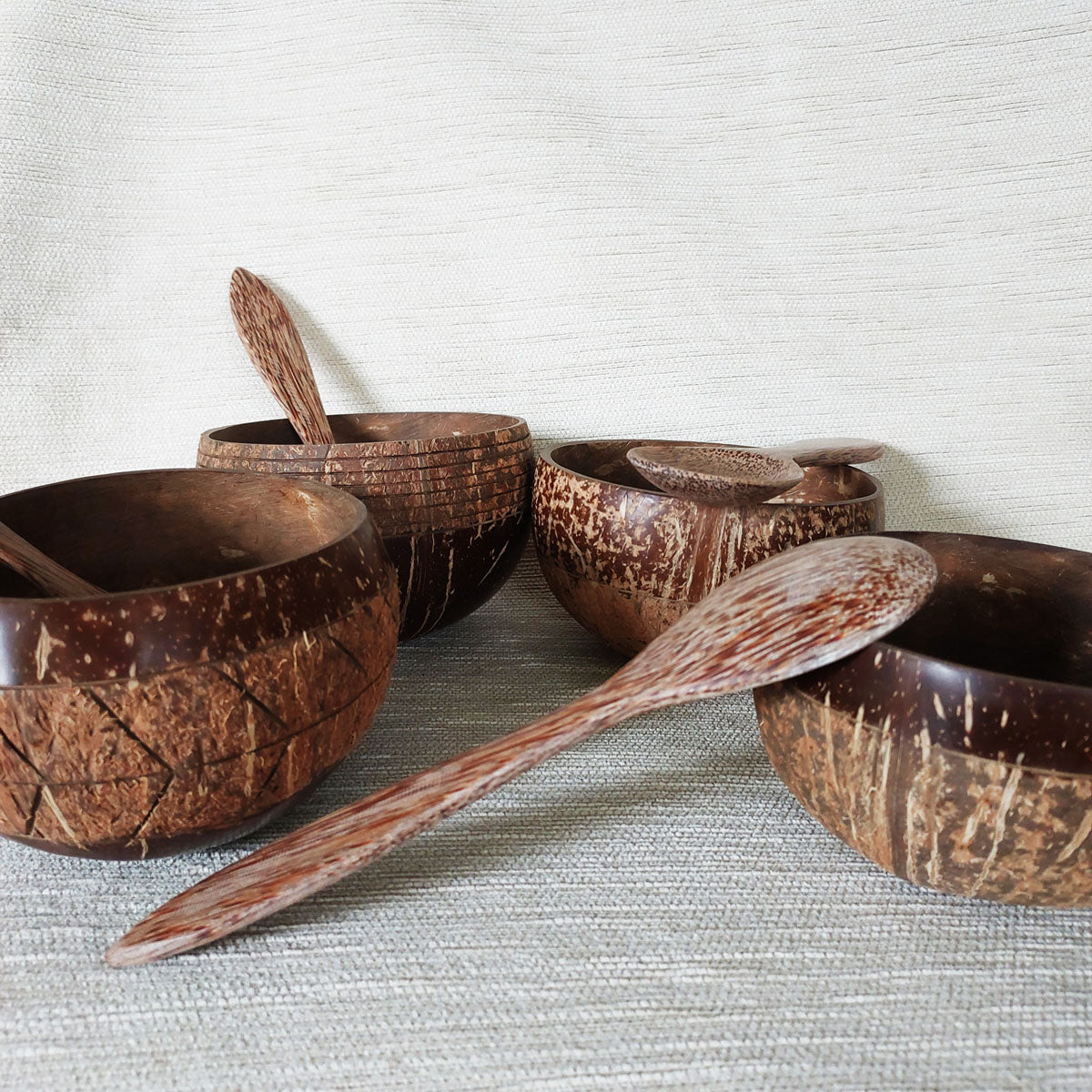 Size - each coconut shell bowl is approx. 4.5" wide 2.5" high. Each coconut wood spoon is approx. 7.5" long.