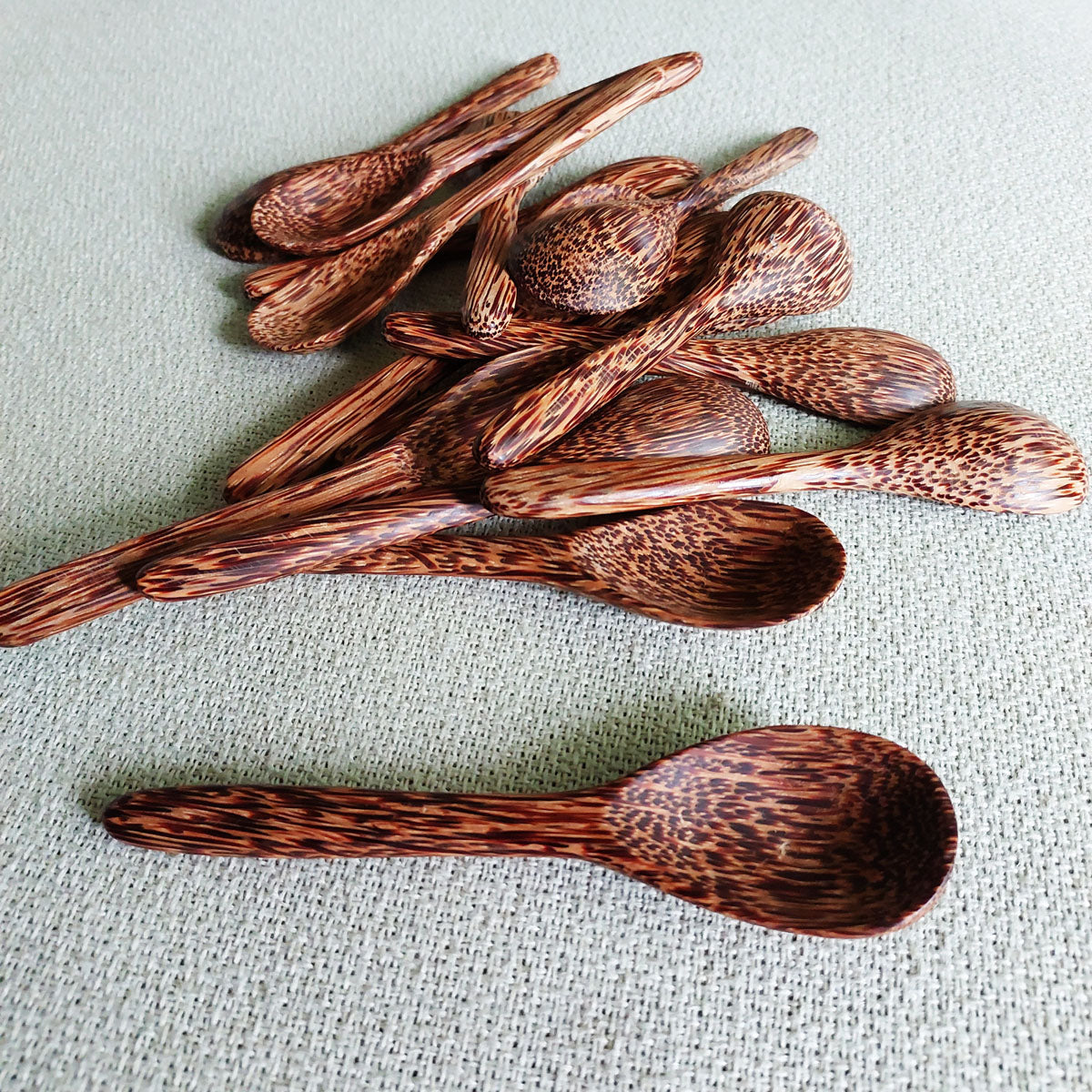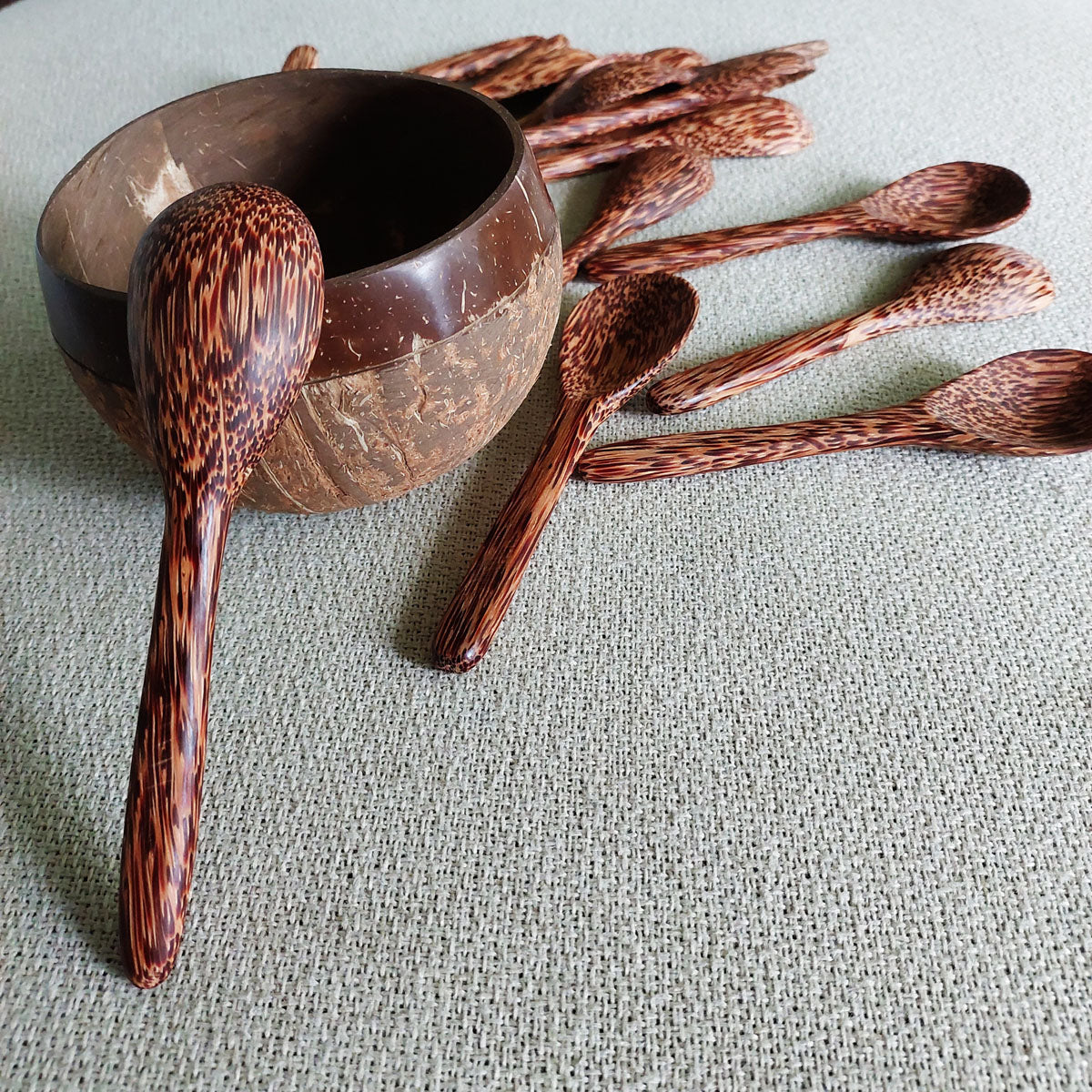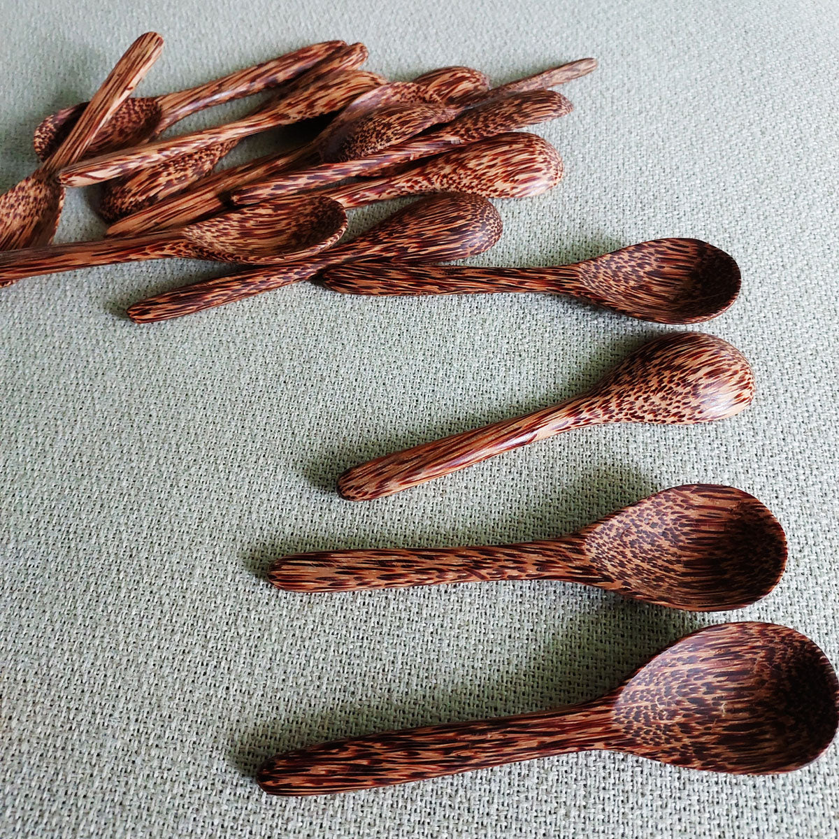 These coconut wood spoons are carefully hand sculptured after the initial shape is cut from a hand-held machine. The grain is so beautiful, it almost feels like someone drew it on by hand! But it's simply the natural coconut wood pattern - the patterns by nature. Ideal as a dessert spoon, curry spoon, or kids cereal spoon. When you choose natural over artificial, you help save the environment. When you choose handmade over mass-made, you help the rural craftsmen/women.