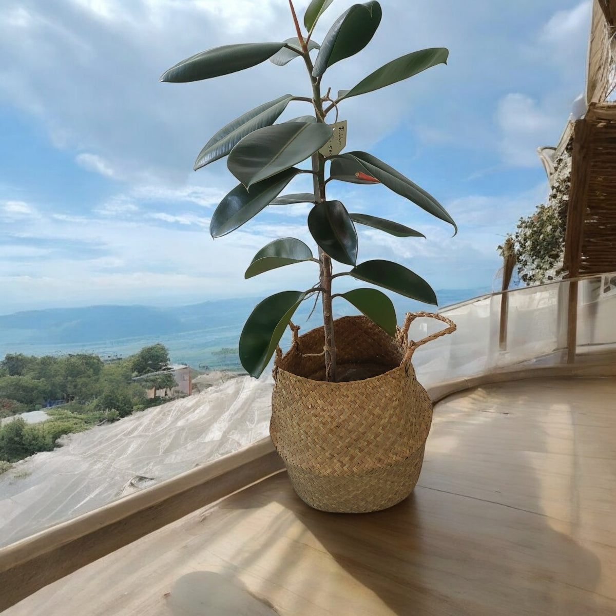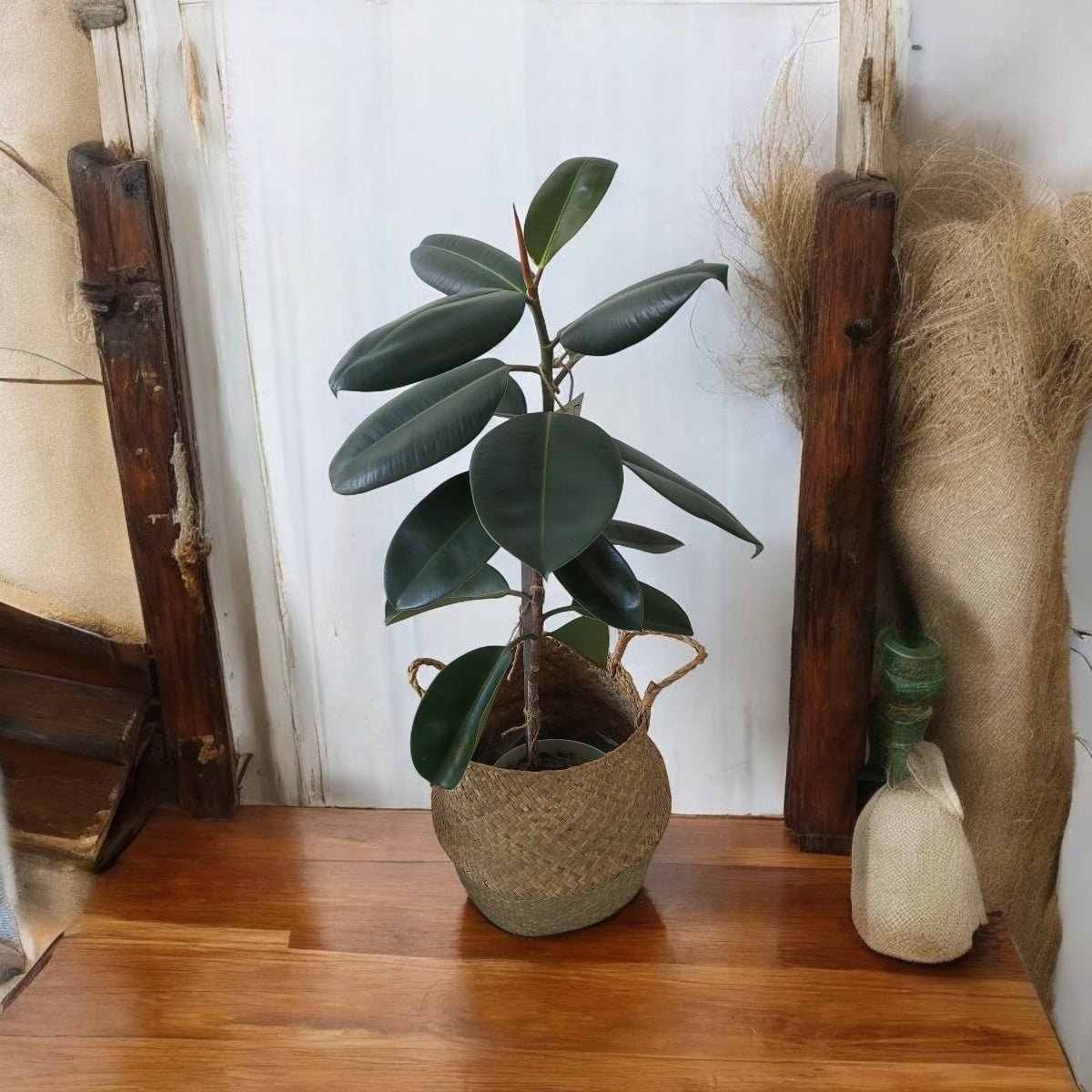 Potted rubber plant in a beautifully hand woven wicker/seagrass/straw belly basket for the indoors. Care instruction and fertilizer comes with it, so you can relax and just enjoy the benefits of it. Not only does it make your home stunning to the eye, but it also has many health benefits such as purifying the air inside your home.